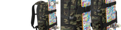 600D polyester. Grab handle. Padded adjustable shoulder straps. Skateboard carry straps. Compression straps. Padded back panel. Main zip compartment. Front and side zip pockets. Internal organiser section. Laptop compatible up to 17". Tear out label. Capacity 23 litres.