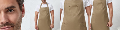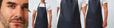 100% cotton twill. Self fabric neckband with buckle and adjustable stud closure. Three chino style stitched pockets with rivets. Width 72cm. Length 86cm. Industrial laundry 85°C. Domestic wash 60°C.