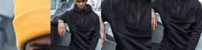 Ribbed cuffs at hem and sleeves, flat kangaroo pocket, outer fabric hood without drawstring and half-moon neck.