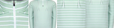 Set-in sleeve. Double-layered hood in self-fabric. Flat drawcords in matching body colour. Embroidered eyelets. Double-needle topstitch on all seams. 2x1 ribs at sleeve cuffs and bottom hem. Kangaroo pocket at front. Inside herringbone back neck tape. Self-fabric half moon at back neck.
