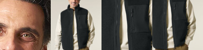 Sleeveless. Elastic recycled binding at cuffs and hem. Inside back neck binding loop and back neck tape. Plastic Vislon zip with metal zip pull and cord ends. Fully bonded inside polar fleece layer with anti-pilling finish. Front side contrast softshell welt pockets with hidden zip closure. Contrast softshell fabric at pocket, back yoke and outer collar band. Inside invisible zip at the wearer’s left chest for easy decoration.