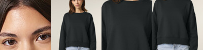Set-in sleeves. Dropped shoulders. 1x1 ribs at collar, sleeve cuffs and bottom hem. Two-needle topstitches on all seams. Inside grosgrain back neck tape. Self-fabric half moon at back neck.