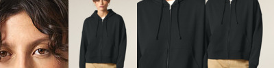 Set-in sleeves. Dropped shoulders. Double-layered hood in self-fabric. Flat drawcord in matching body colour. Embroidered eyelet. Covered metal zip at centre front. 1x1 ribs at sleeve cuffs and bottom hem. Two-needle topstitches on all seams. Inside grosgrain back neck tape. Self-fabric half moon at back neck.