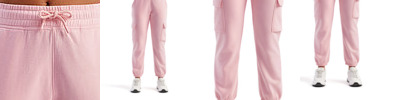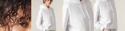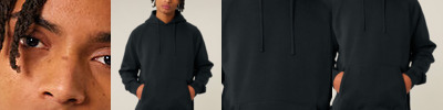 Raglan sleeves. Double-layered hood in self-fabric. Kangaroo pocket at front. 1x1 ribs at sleeve cuffs and bottom hem. 1x1 rib side panels. 1x1 rib bindings at pocket openings. Double-needle topstitches at the collar, sleeve cuffs and bottom hem. Three-needle flatlock stitches at raglan seam and side panel seams. Inside herringbone back neck tape. Self-fabric half moon at the back neck.