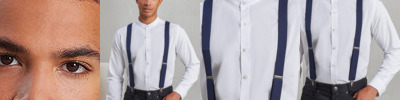 Y back trouser braces with stretchy elastic fabric for comfort and style. 3cm strap width. Two metal non slip clips to the front for attachment to trousers. One clip to the back. Metal lock buckles for adjustment making a one-size-fits-all piece.