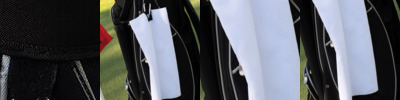 Microfibre tri-fold golf towel. Grosgrain ribbon tab with metal eyelet and snap hook attachment. Carabiner clip. Overlocked edge.