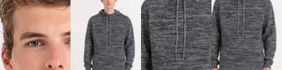 Chunky tuck stitch knitted hoodie made from regenerated yarn. Featured hood with drawcords, rib at cuffs and hem and two-tone yarn.