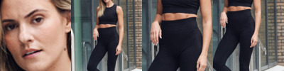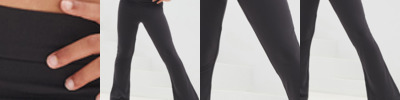 80% polyester/20% elastane interlock. Peached finish. Soft-touch fabric. Non-transparent. High waisted self fabric waistband with inner elastic band. Hidden pocket in rear waistband. Gusset panel at crotch. Front and back rise seams. Twin needle hems. Tag free.