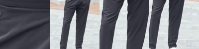 90% polyester/10% elastane. Four-way stretch microfibre. Anti-static properties. Flat front waistband, elasticated rear with inner drawcord. Two side zip pockets. Rear zip pocket. Rear yoke panel with centre seam. Tapered leg. Tear out label.