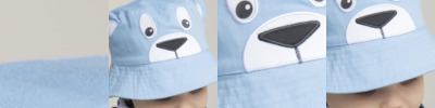 100% cotton twill. Flat top. Two embroidered characters, bear and bunny. Stitched brim. Elasticated back. Tag free.