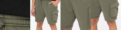 85% organic combed cotton/15% recycled polyester. French terry inner. Enzyme washed. Elasticated waistband with flat drawcord and recycled plastic tips. Mock fly. Two side pockets. Two side leg cargo pockets with flap closure. Rear patch pockets. Tag free. Garment dyed after assembly, colours may vary slightly. The colour may rub off on contact with light surfaces or clothing. Recycled polyester is made from post-consumer waste.